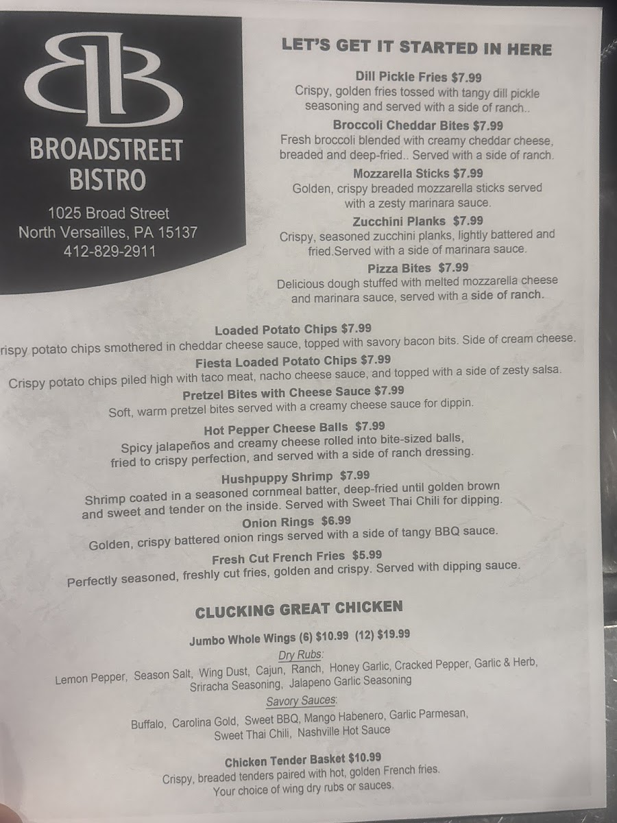 Welcome to Broadstreet Bistro, where comfort food meets community charm in North Versailles, PA. Nestled at 1025 Broad St, this bistro offers a delightful menu that captures the essence of home-cooked meals. Start your culinary journey with their popular homemade Chili and daily soup selections, perfect for warming your soul.